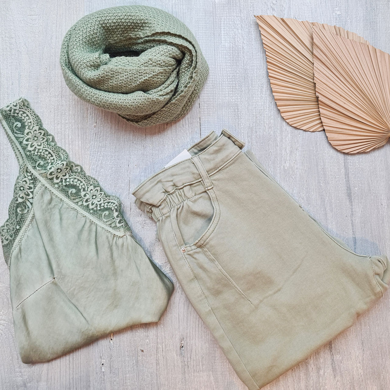 Schal, Spitzentop und Jeans in Salbei aufeinander abgestimmt – eine toller Look